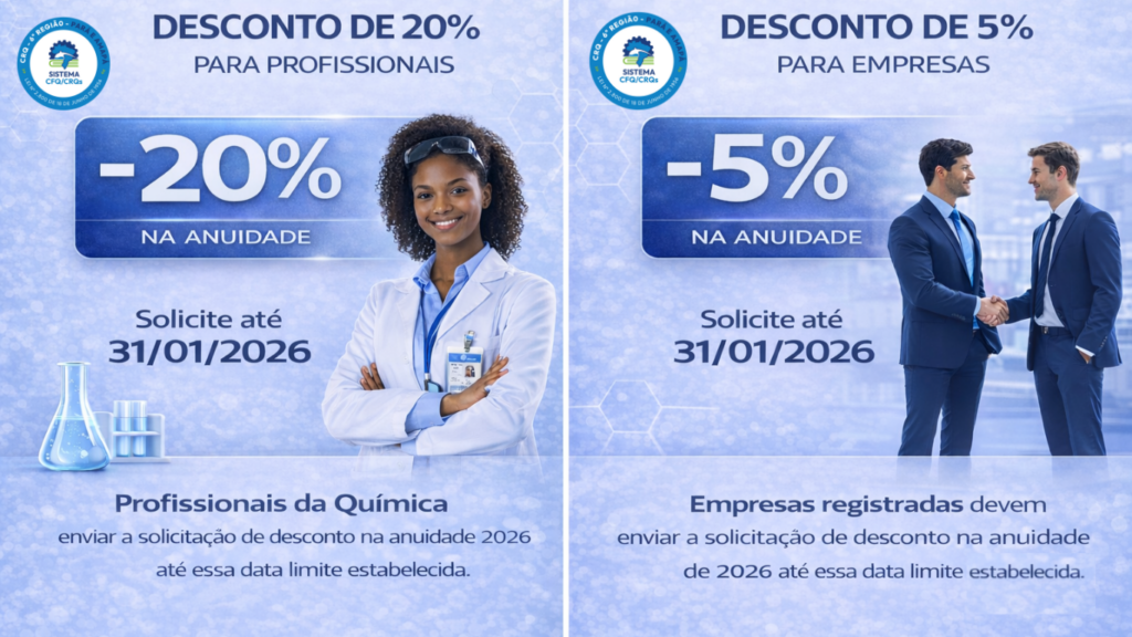 🔔 Atenção, Profissionais e empresas da área da Química! O CRQ-VI informa que o pagamento da Anuidade 2026 pode ser realizado com descontos para efetuarem a quitação até 31 de[…]